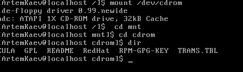 Добраться до CD нет так просто как кажется. Зачем вообще добираться ? Для начала для того, что бы поставить программу Midnight Commander которая является аналогом Norton Commander или Volcov, кому как нравиться. Для того, что бы добраться до CD его нужно смонтировать. Получиться это у Вас или нет, зависит от настроек. По умолчанию должно появиться. Для начала спустимся в самый корень каталога. Дадим команду монтирования.