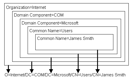 Это имя обозначает объект типа “пользователь” с именем “James Smith”, находящийся в домене Microsoft.com.